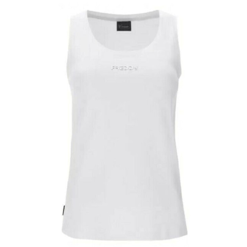 Μονόχρωμο μπλουζάκι – φανελάκι φτιαγμένο από ελαστικό βαμβακερό ύφασμα με πλέξη τύπου ζέρσεϊ, φινιρισμένο με μια μικρή ασημί στάμπα στο κέντρο με το λογότυπο FREDDY.