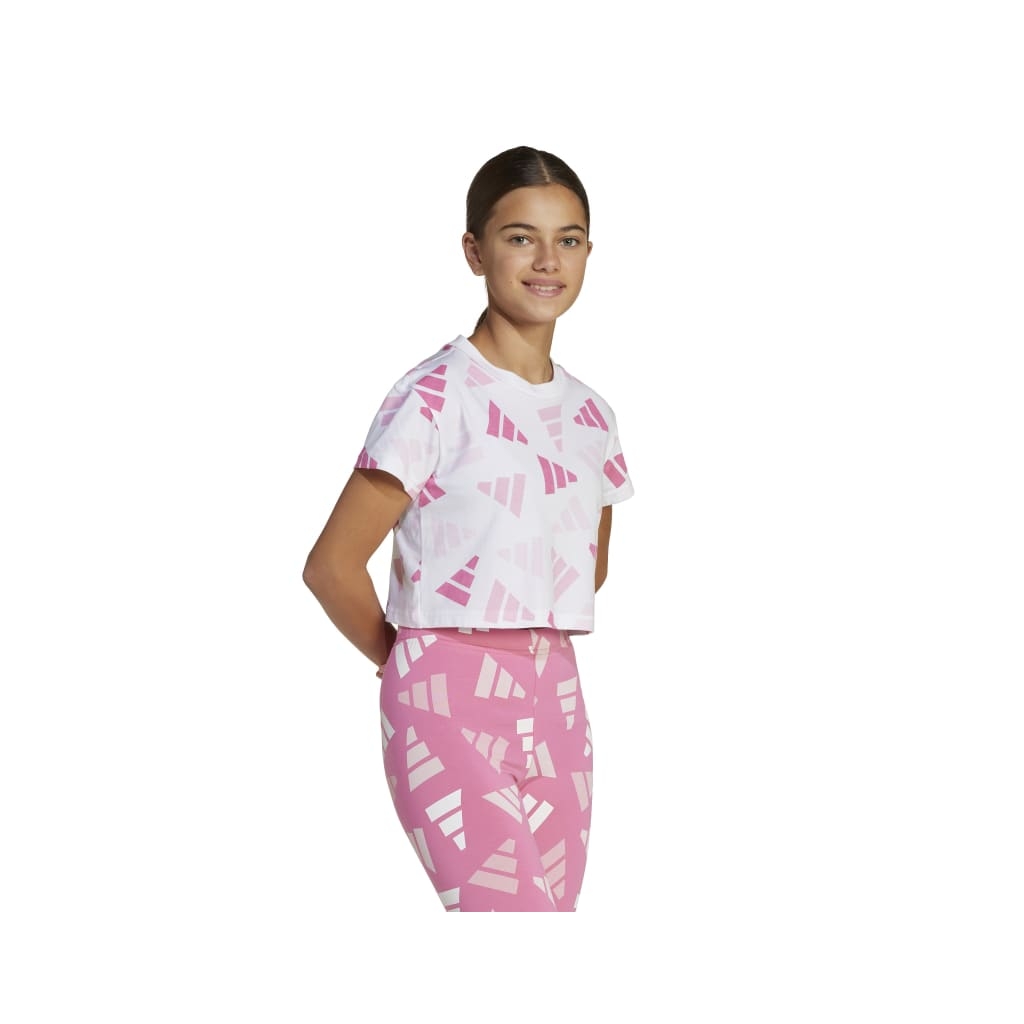 To Adidas Performance Sportswear Celebration παιδικό cropped κοντομάνικο T-Shirt σε λευκό, ροζ και φούξια χρώμα θα γίνει το απόλυτο must-have κομμάτι για το παιδί σου.