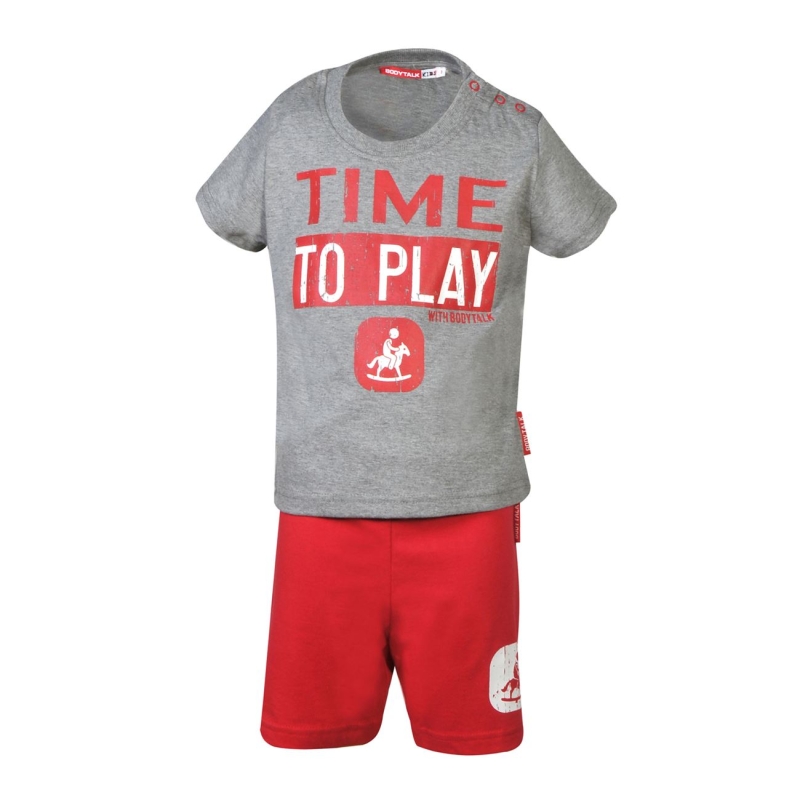 Βρεφικό σετ, t-shirt και βερμούδα. Αποτελείται από 100% βαμβάκι και είναι διαθέσιμο σε ένα (1) χρώμα γκρι μελανζέ, και – φυσικά – σε πολλά μεγέθη.